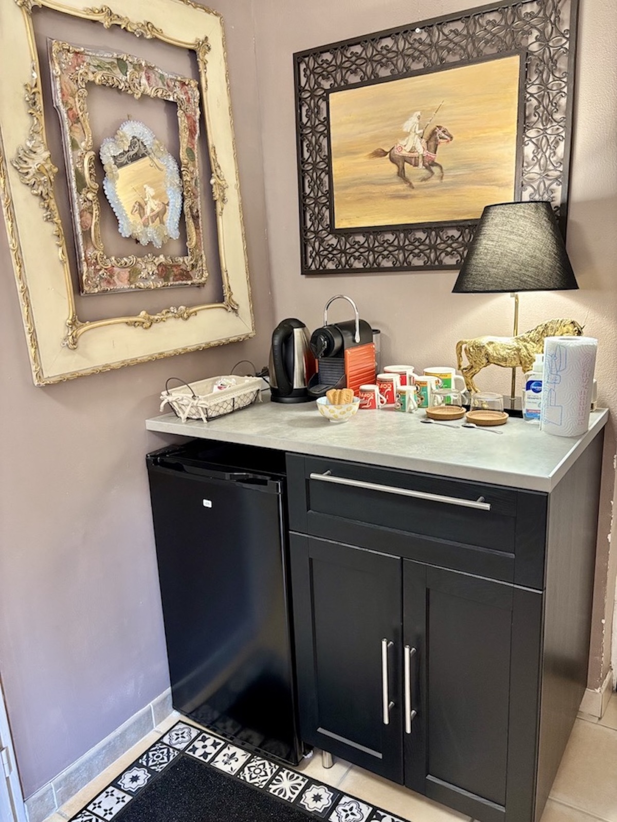 Un espace courtoisie est à votre disposition avec cafetière, bouilloire, vaisselle et petit réfrigérateur, permettant de préparer des collations ou repas froids en toute autonomie, dans le confort de votre chambre.