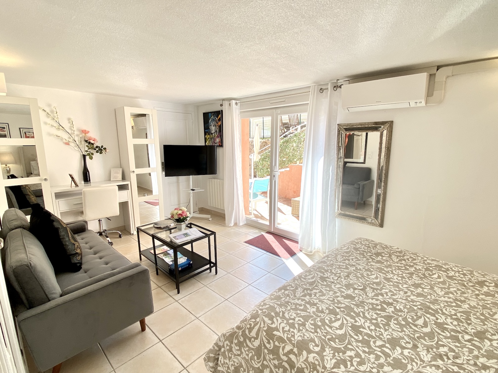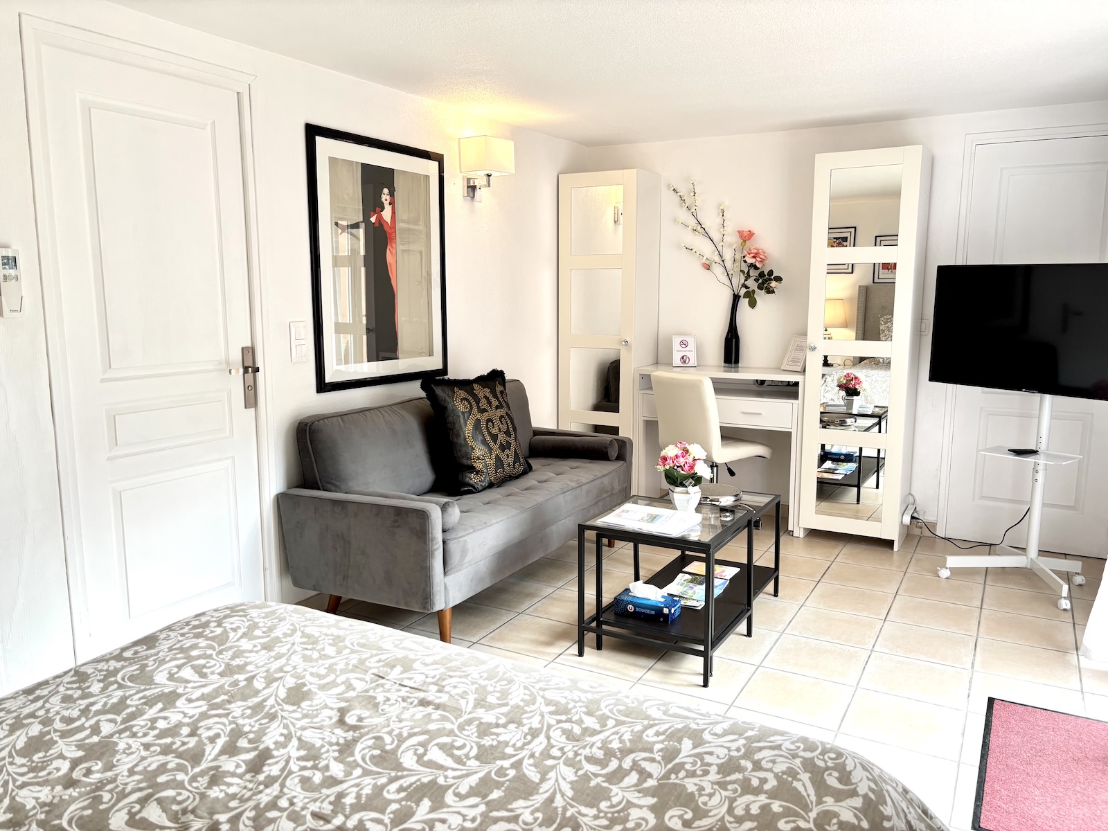 Spacieuse et lumineuse, la chambre Dolce Vita invite à la douceur de vivre avec son accès direct à la terrasse et son entrée indépendante.