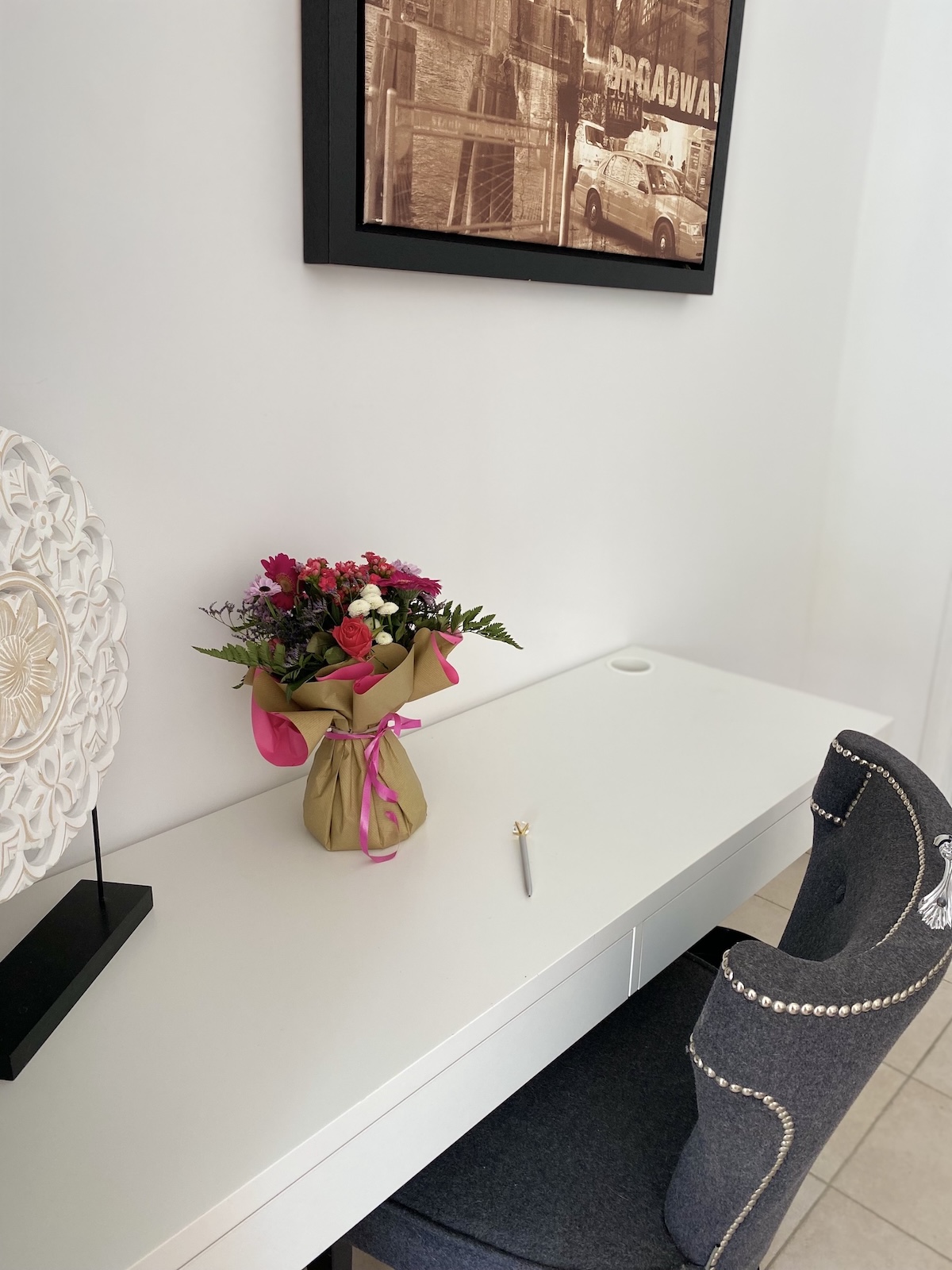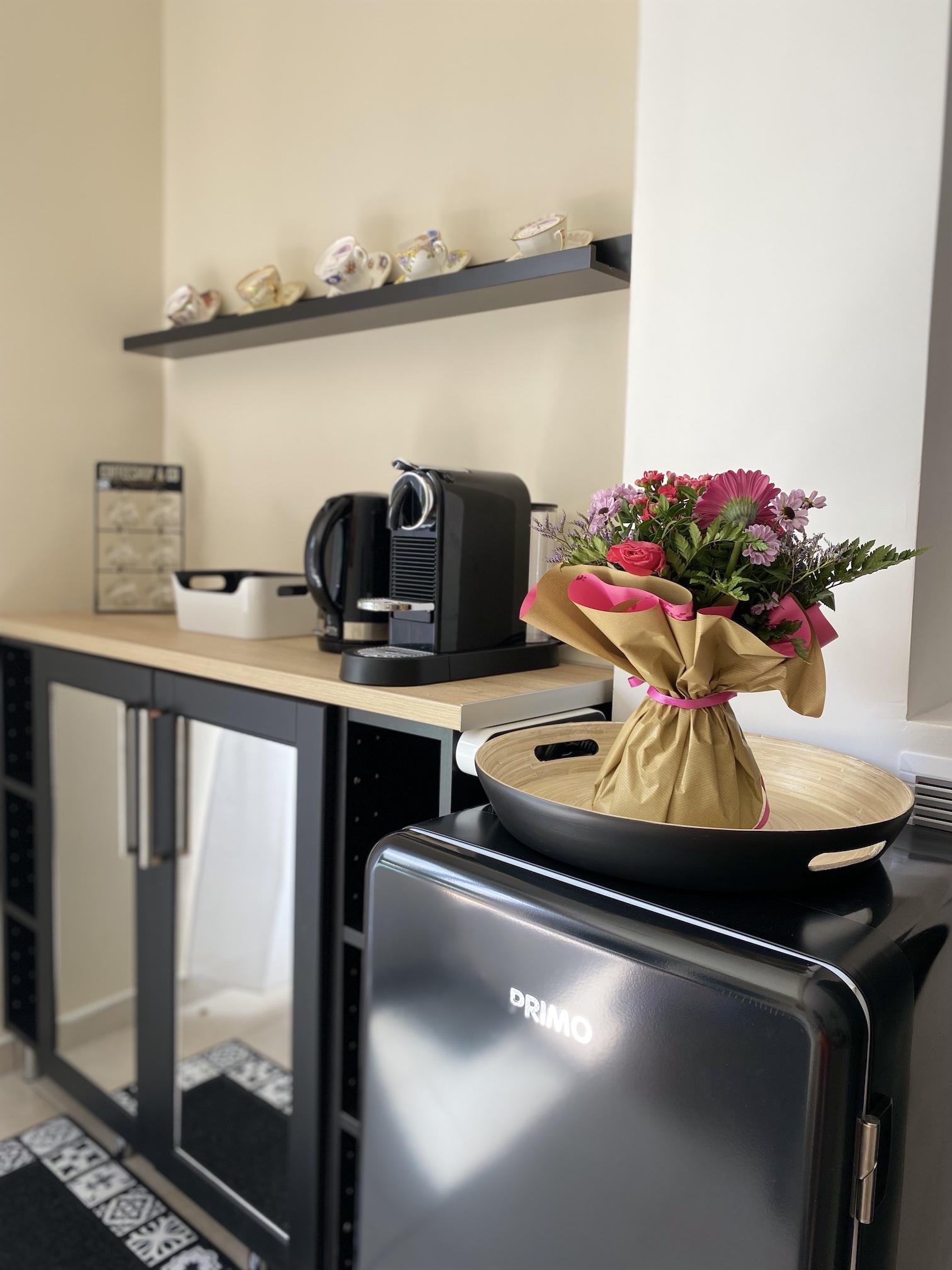 Un espace courtoisie est à votre disposition avec cafetière, bouilloire, vaisselle et petit réfrigérateur, permettant de préparer des collations ou repas froids en toute autonomie, dans le confort de votre chambre.